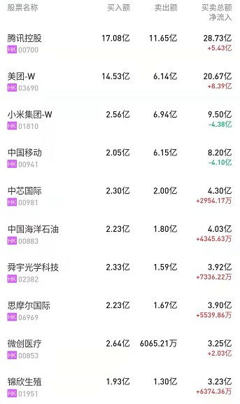 成交活跃股方面,沪市港股通前十大成交活跃股中,腾讯控股成交额为11.75亿港元,成交金额居首;其次是中国海洋石油、中国移动,成交金额分别为11.36亿港元、6.90亿港元。以净买卖金额统计,港股通(深)净买入亿港元比亚迪股份净买入额为3.74亿港元,净买入金额居首,该股收盘股价上涨5.82%。净卖出金额最多的是中国移动,净卖出3.47亿港元,收盘股价上涨1.09%。