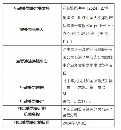中国太平洋财产保险石河子中心支公司被罚万元:虚挂中介业务套取费用