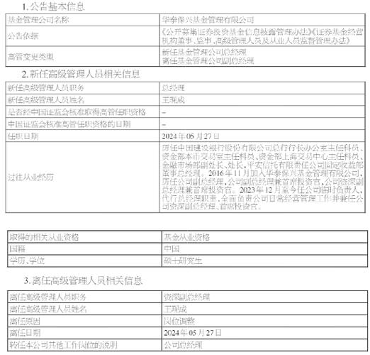 在金融界的广阔舞台上,每一次高层人事变动都牵动着市场的神经,尤其是那些在业界有着深厚背景和丰富经验的领导者。近日,华泰保兴基金宣布,王现成先生正式转正出任公司总经理,这一消息无疑为基金行业带来了新的关注焦点。王现成先生的履新,不仅标志着他个人职业生涯的新起点,也预示着华泰保兴基金即将开启的新篇章。